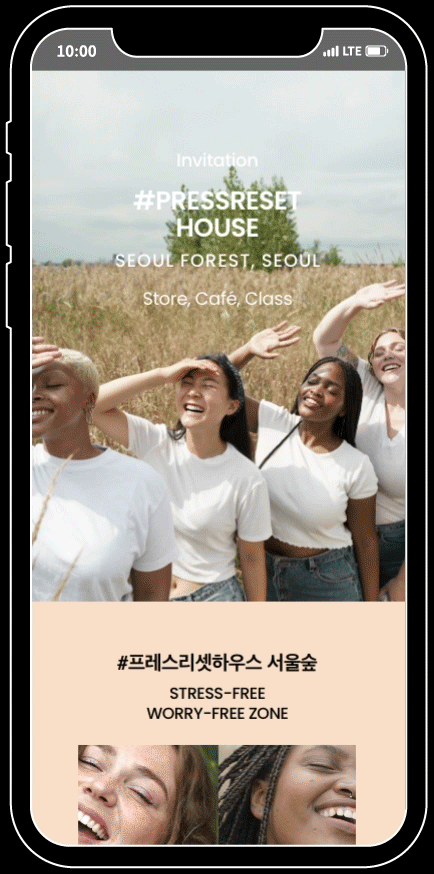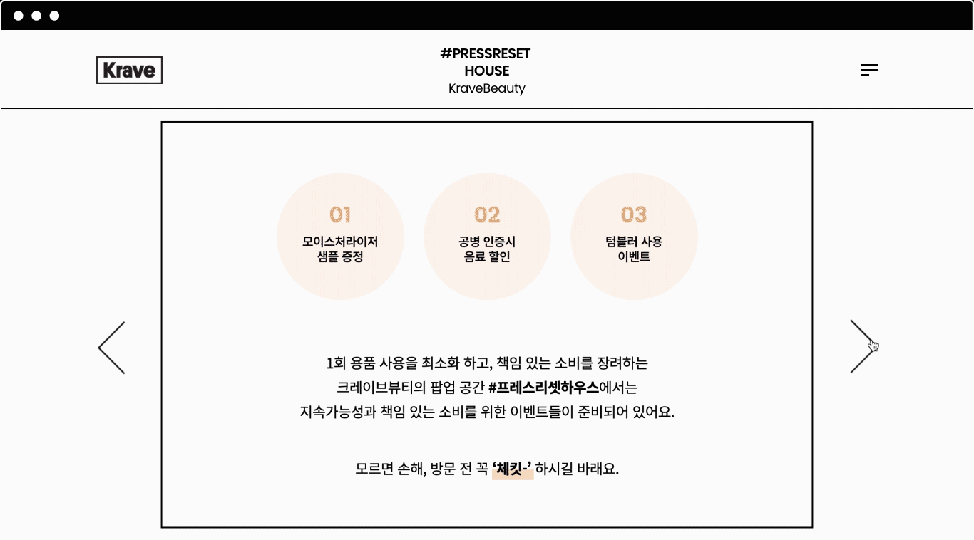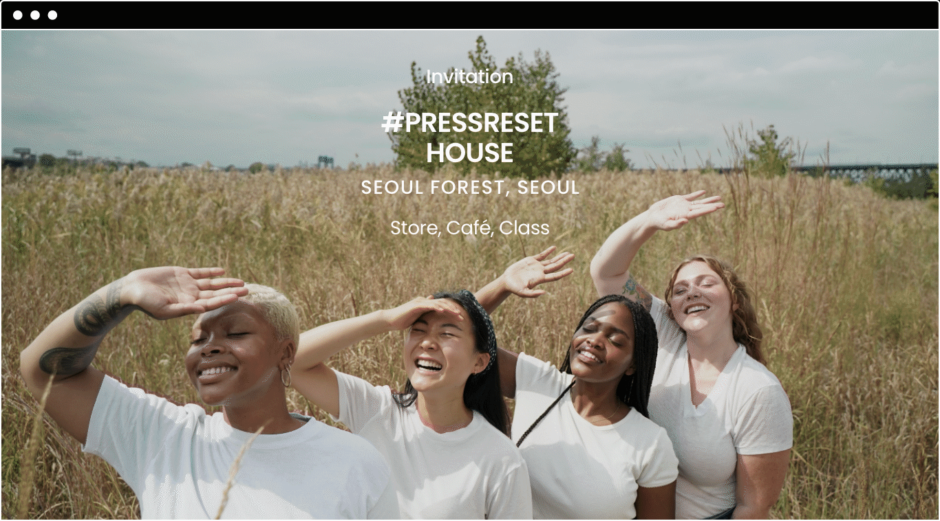 코스메틱 브랜드인 KraveBeauty의 #PressResetHouse 온라인 팝업스토어 페이지를 PC, Mobile 등 각 기기의 특성에