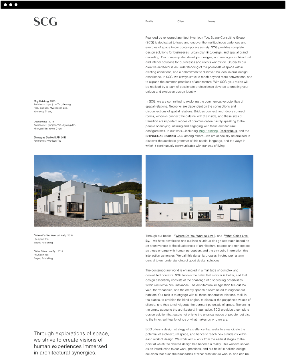 유현준 대표가 운영하는 공간 맞춤 컨설팅 그룹인 SCG의 홈페이지 제작하였다. 카고 컬렉티브를 기반으로 PC, Mobile 각 기기의 특성에 맞추어 반응형으로 제작했다.